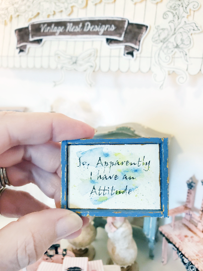 A one of a kind miniature sign with the quote, “So Apparently, I have an Attitude”. The background is in yellow and blue watercolors with splashes of paint. The sign is wooden and is handmade by me and is painted blue and dusted with gold for an elegant style.