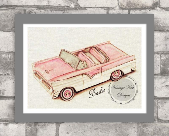 A vintage pink barbie car. A print from my original drawing and watercolor painting. Great to use as an artist print, instant download, digital download, printable art, digital paper, digital print, digital background, digital art, digital backdrop, doll painting, watercolor doll, doll art, or doll print.