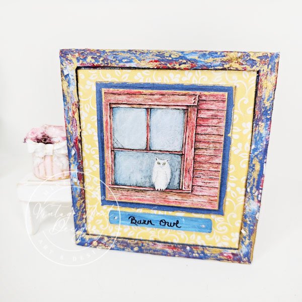 A miniature framed art for a doll house room. It is wooden framed handmade miniature by me of a white owl sitting in an old red barn window. It is painted red with touches of black and brushed with touches of gold for an elegant style. The image itself has an overlay of hand cut trees and a barn from my original drawing and painting.
