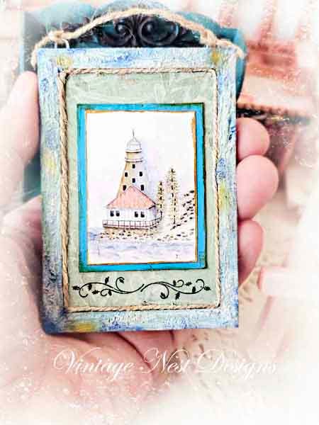 A scene of a Lighthouse nautical scene along the water. The frame is wooden and handmade by me. It it painted in blue and ochre.