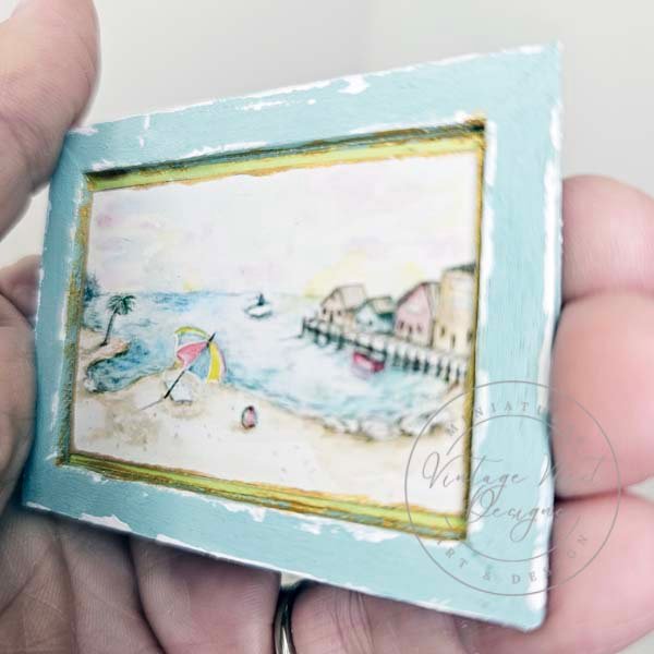 A dollhouse miniature of a beach scene. Just imagine getting away and lying on the beach towel soaking up some sun. A print from my original watercolor painting. The sign is wooden and is handmade by me and is painted blue and dusted with white for a shabby style.