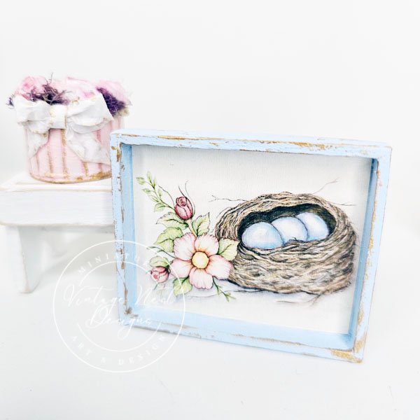 A bird nest filled with eggs and lovely roses. A print from my original watercolor painting. The frame is wooden and handmade by me. It is painted blue and brushed with touches of gold for an elegant style.