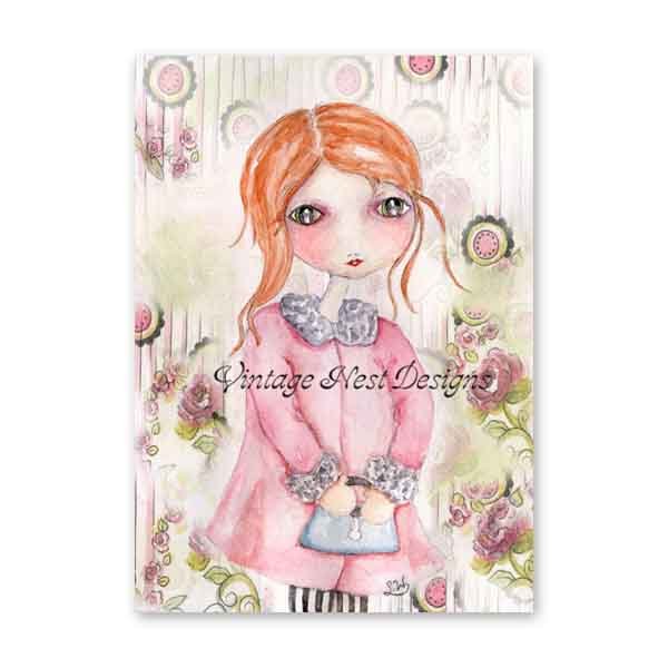 A print from my original drawing and watercolor painting of a little girl in her winter outfit holding her purse. It has my hand drawn frame and paper design in the background. Perfect for a framed print, digital scrapbooking, greeting cards, or give as a gift.