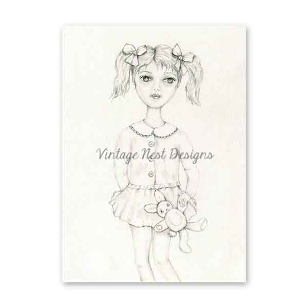 Doll with Bunny Graphic No.1 Digital Print Pencil Drawing