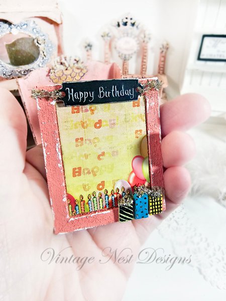 A sweet Happy Birthday miniature. It has tiny gifts at the bottom with frilly bows and a background print with balloons and candles. The frame is wooden and handmade by me. It is painted in a salmon color and brushed with touches of white for a shabby style.