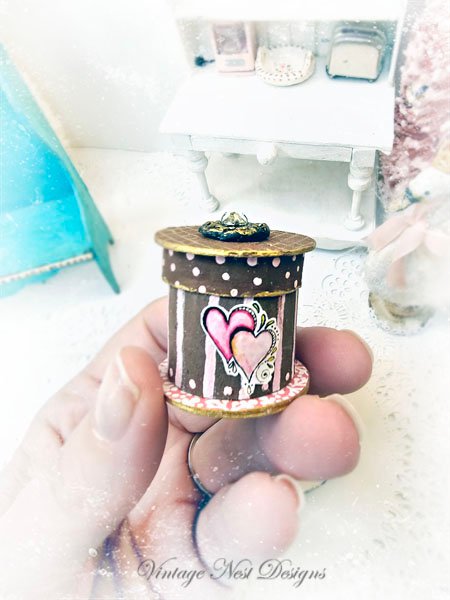 A one of a kind, dollhouse miniature of one of my designed boxes. It is hand painted in brown and pinks and trimmed in gold. The lid has a sweet little motif with a faux diamond on it. It does open for added storage. It is hand painted and designed by me. The front of the box has my hand drawn and painted hearts.
