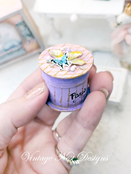 A one of a kind, dollhouse miniature of one of my designed hat boxes. It does open for added storage. It is hand painted by me and the box has, “Paris” written on the front. It is hand painted in lavender and trimmed in gold. The lid has a sweet little handmade elements in it.