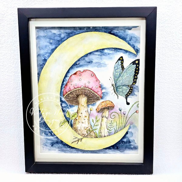 Mushrooms, butterfly and the moon. An original watercolor painting. Perfect as a framed print or give as a gift.