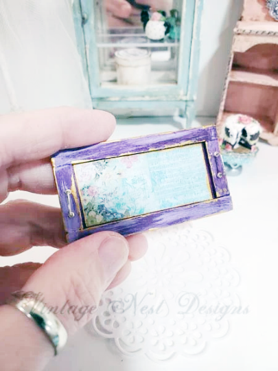A sweet lavender tray with lovely floral blue wallpaper. The frame is wooden and handmade by me. The handles are made of metal and silver beads. Perfect for a dollhouse, diorama room, shadow box, or give as a gift.