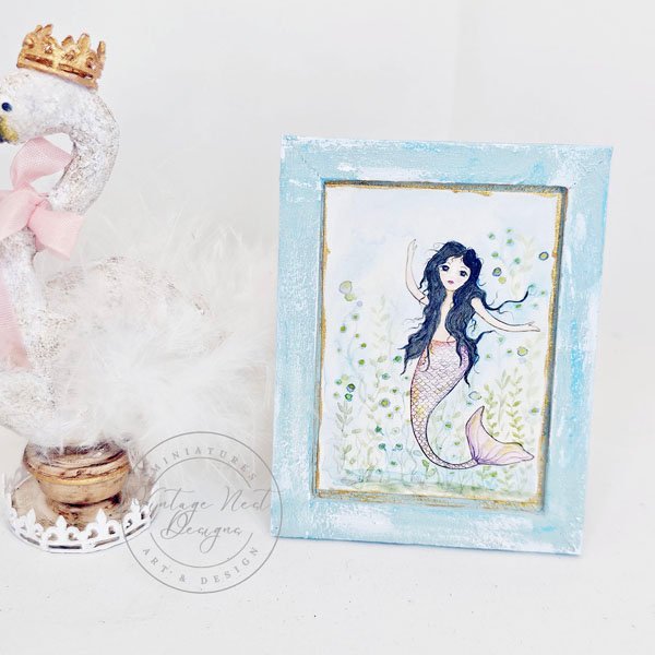 A whimsical dollhouse miniature of a mermaid under the sea. The frame is wooden and handmade by me. It is painted blue and dusted in white for a shabby style.