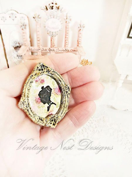 A dollhouse miniature of a lovely silhouette beauty in a handmade framed painted blue and dusted with gold. An original watercolor hand painted by me. The image has my hand painted roses in watercolors in the background. She has tiny white pearls for a necklace.